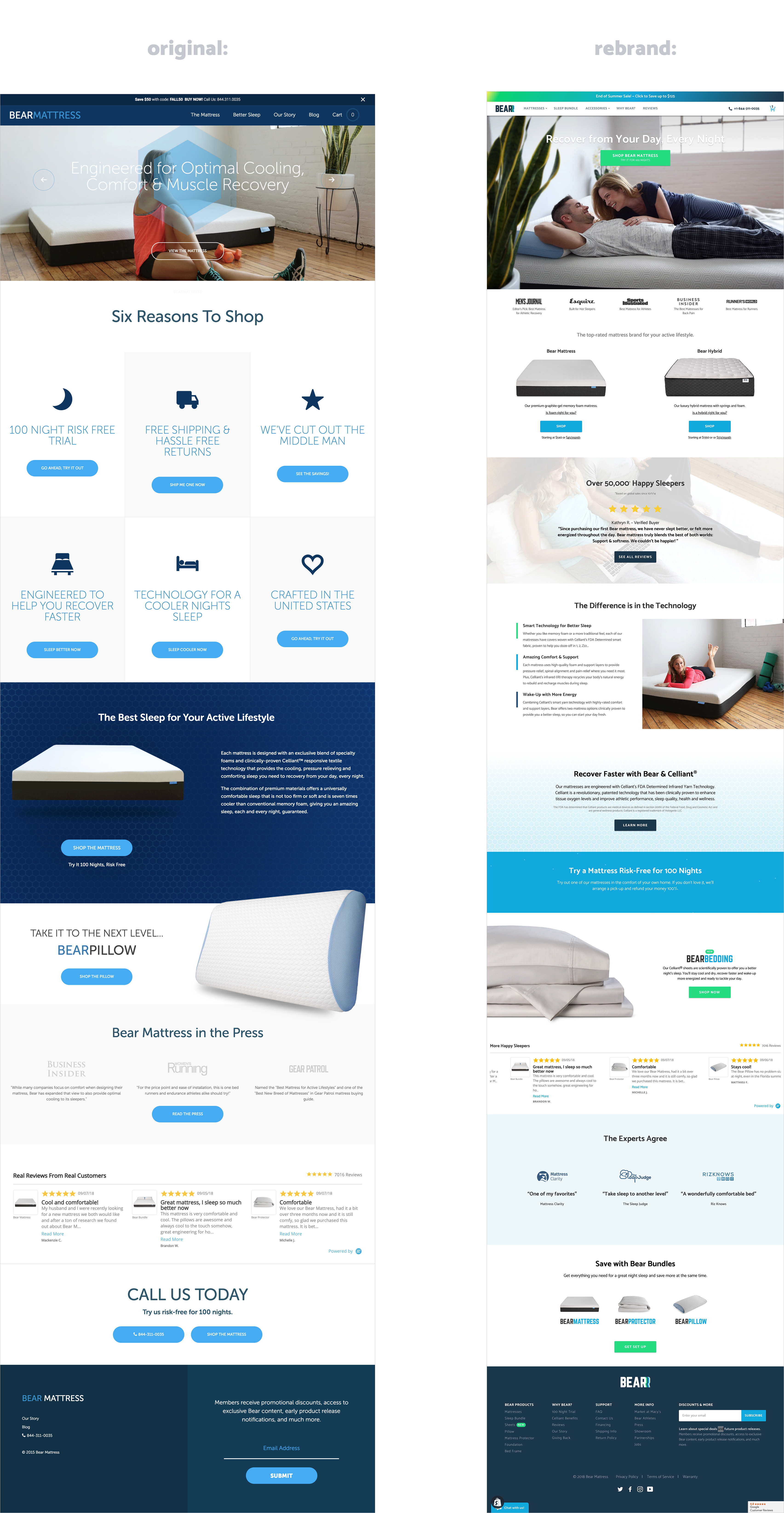 The primary goal driving the website revamp was an increase in conversions. Our conversion rate at the time was under 1.5%, falling short of the average ecommerce conversion rate of 2.5%. I conducted user surveys, created personas and researched ecommerce conversion tactics in an effort to hone in the design and customer journey of bearmattress.com. Within 6 months of the revamp, our conversion rate shot up above 2% for the first time and soon after, we hit 3%, effectively doubling our sales.
